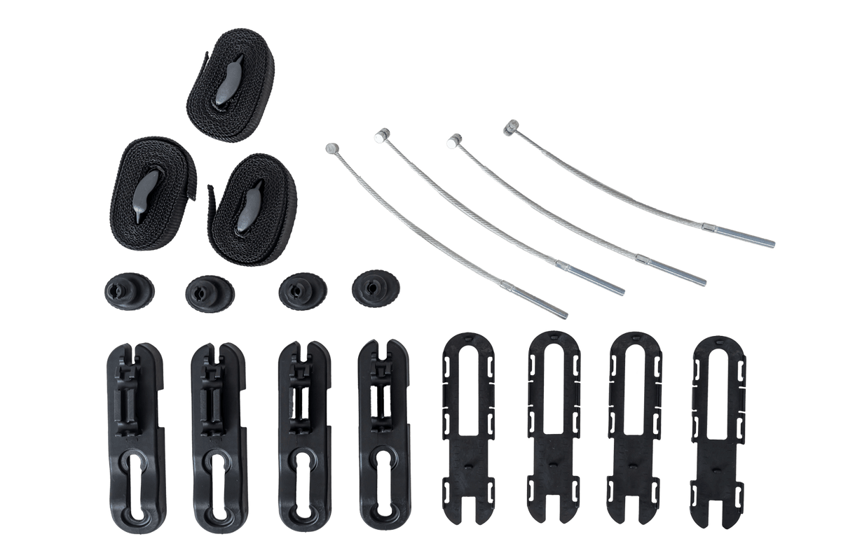 Sada obsahuje také textilní popruhy pro zajištění zavazadel během přepravy (krabice má vyhrazená místa pro uchycení popruhů zabudovaných v montážním systému).