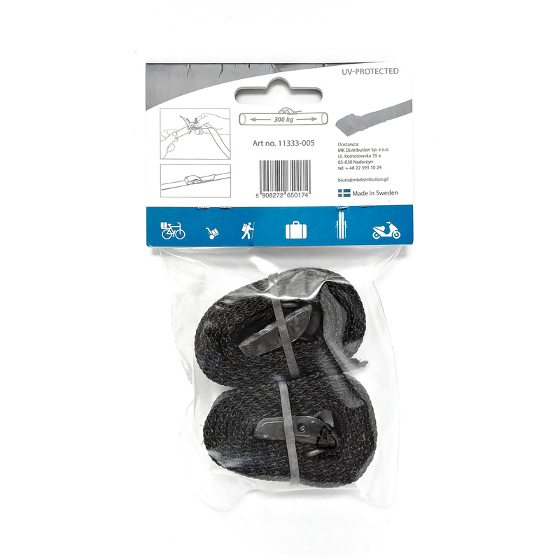 Wytrzymałe paski tekstylne z metalowymi sprzączkami, każdy z pasków ma długość 100 cm. Można je wykorzystać do mocowania bagażu w boxie dachowym, kół rowerów do uchwytów rowerowych a także do wielu innych zastosowań w domu i warsztacie. Dzięki zastosowaniu metalowej blokady (sprzączki) taśma pozostaje cały czas napięta.