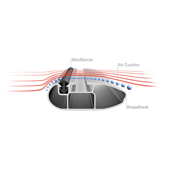 Dodatkowo WindBarrier tworzy małe wiry, tworząc poduszkę powietrzną na powierzchni poprzeczki, która działa jako mostek dla strumienia powietrza nad rowkiem T, zapobiegając powstawaniu hałasu w każdych warunkach jazdy. Nawet po rozładowaniu nie trzeba zakrywać gniazda, aby zapobiec hałasowi.