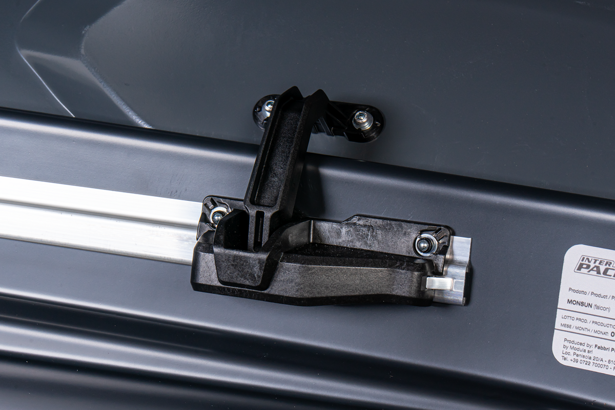 Montážní systém je namontován na pohyblivých lištách a umožňuje nastavení rozteče příčných nosníků střešního nosiče , která musí být mezi 46 cm a 115 cm . Systém Rapid Fit je také vybaven dynamometrem , který signalizuje správné upevnění boxu a minimalizuje riziko poškození základního nosiče nebo střešního boxu.