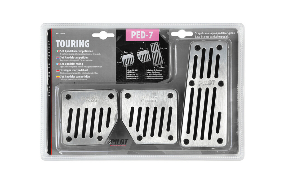 TOURING ČERNÝ – Hliníkové kryty pedálů LAMPA představují stylový a praktický způsob, jak oživit interiér vašeho vozu a zlepšit jízdní komfort . Sada obsahuje kryty na plynový, brzdový a spojkový pedály , které díky elegantní černé povrchové úpravě dodávají kabině moderní, sportovní a cestovní charakter. Jsou vyrobeny z lehkého a odolného hliníku , zajišťují odolnost a jistější oporu při každodenní jízdě i delších cestách.