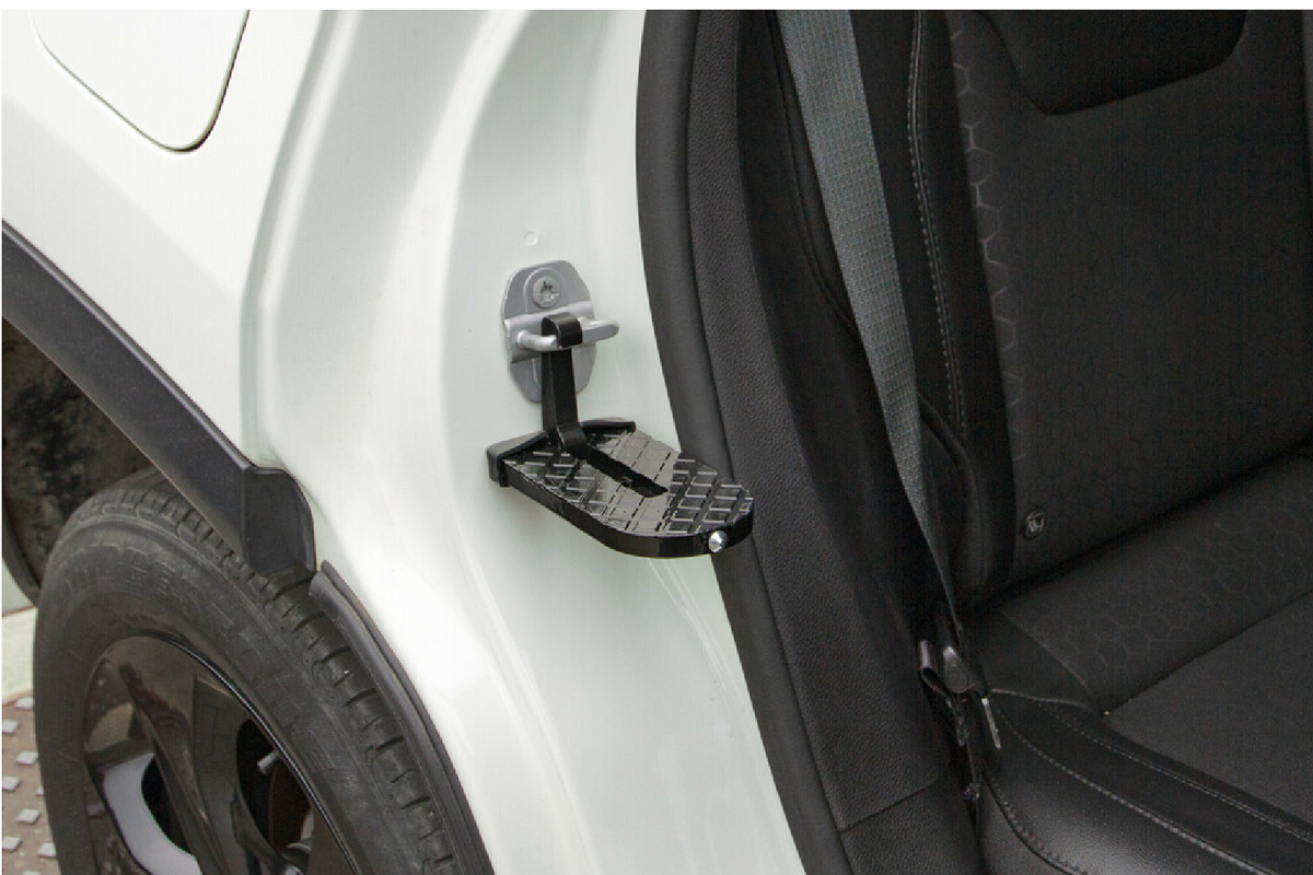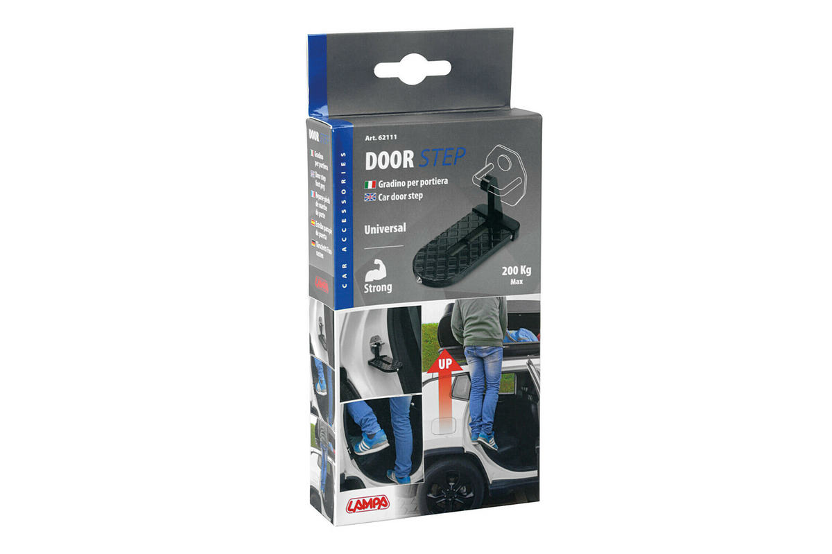 Instalace do zamykací západky trvá jen pár okamžiků a nevyžaduje žádné nářadí. Po použití lze příslušenství snadno uložit do přihrádky v palubní desce nebo do zavazadlového prostoru. Stupačka je vyrobena ze slitiny hliníku a gumová podložka proti poškrábání chrání lak a sloupek dveří.