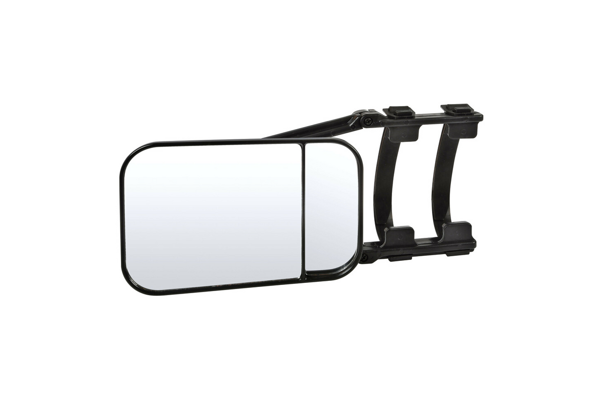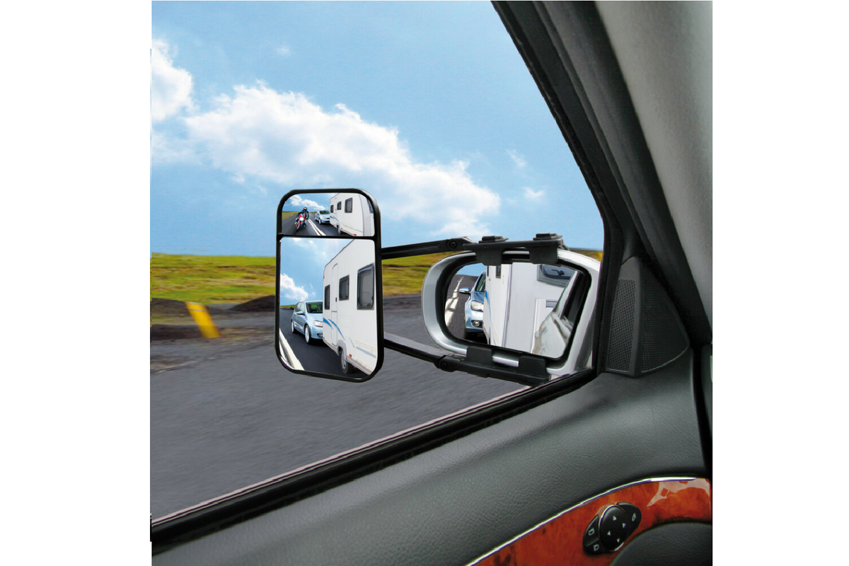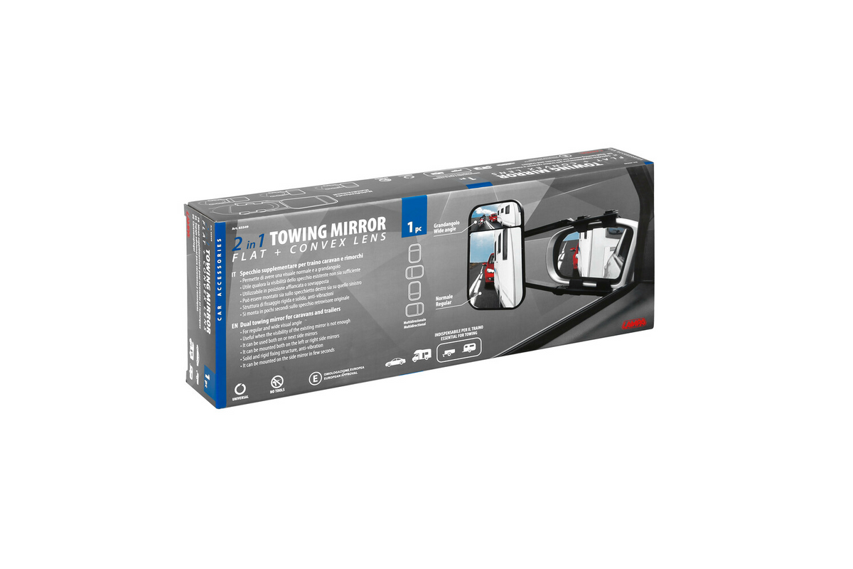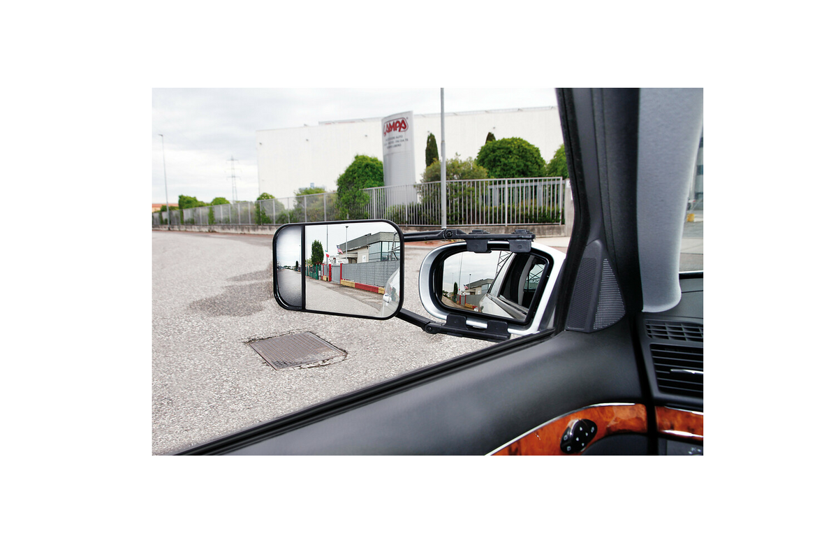 Tažné zrcátko s plochým a konvexním zorným polem je univerzální příslušenství, které se montuje na boční zrcátko z výroby a výrazně rozšiřuje zorné pole při tažení přívěsu. Dvojité zorné pole poskytují přesné pozorování a širší úhel pohledu, zatímco plné nastavení umožňuje optimální úhly pohledu. Systém upevnění s upínacími popruhy je kompatibilní s většinou zrcátek a bezpečně drží zrcátko v pouzdře, čímž snižuje vibrace během jízdy. Zrcátko je univerzální – lze jej namontovat na levou i pravou stranu vozidla. Výrobek je schválen dle normy ECE R46 .