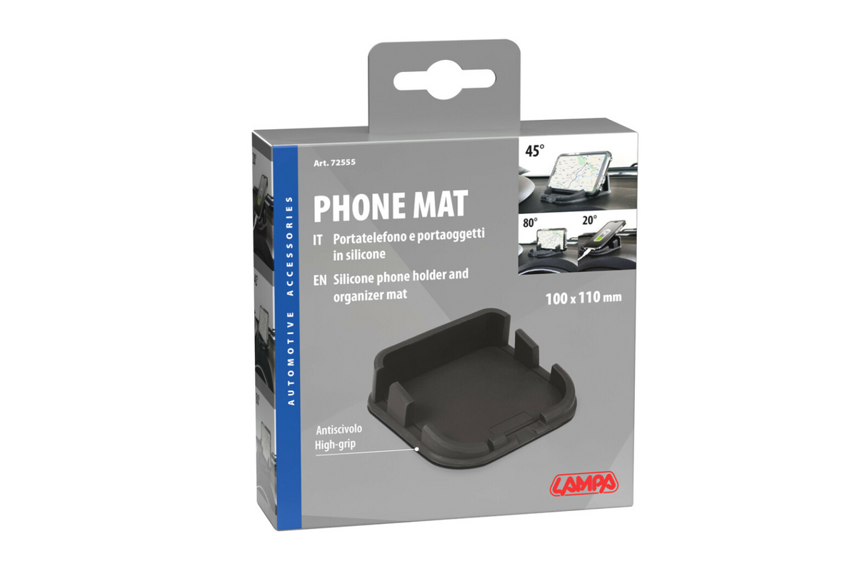 - Silikonová podložka na telefon o rozměrech 110x110 mm pojme váš telefon a drobné předměty, jako jsou mince, klíče a karty. Má 3polohové nastavení úhlu, takže si telefon snadno a pohodlně umístíte. Nevyžaduje lepidlo a snadno se čistí.
