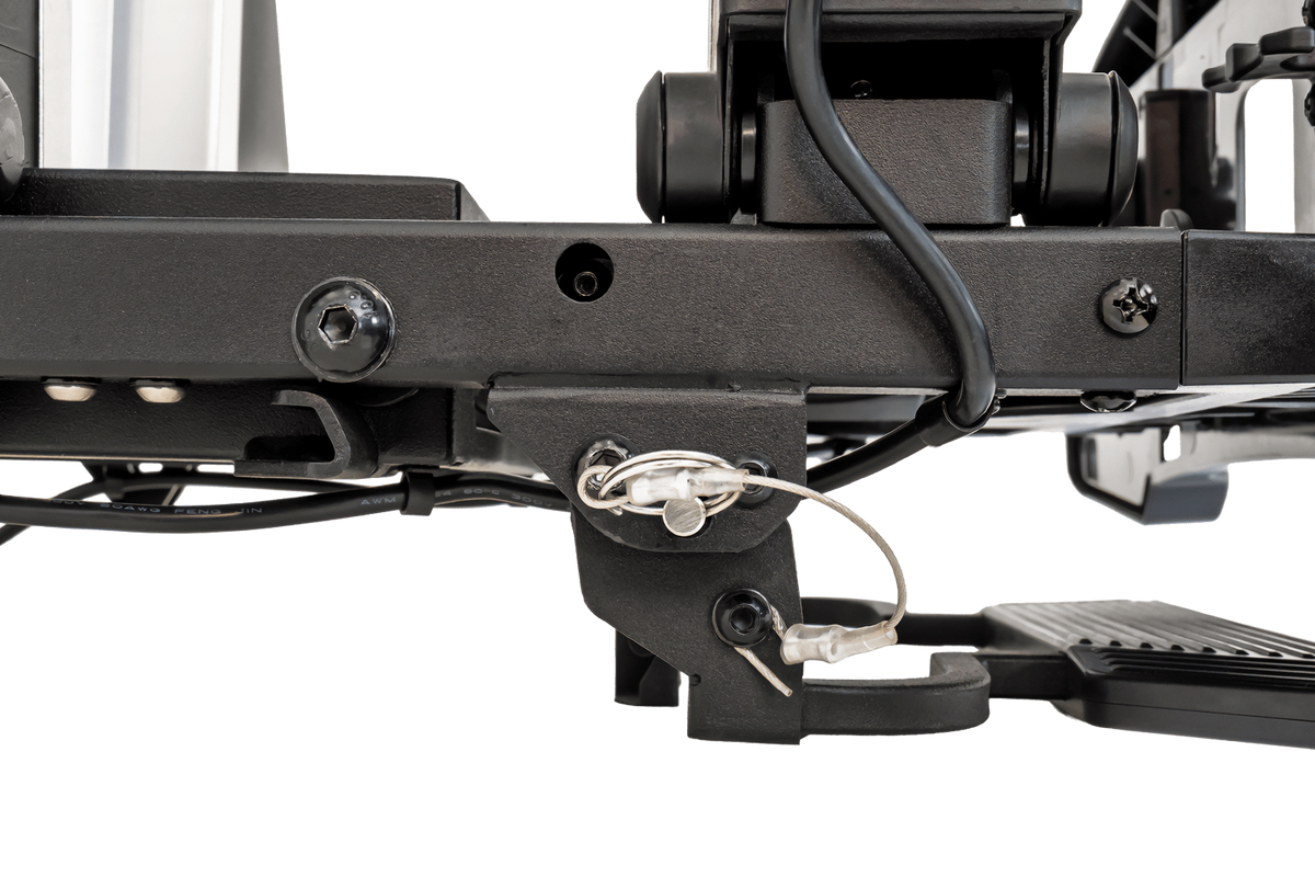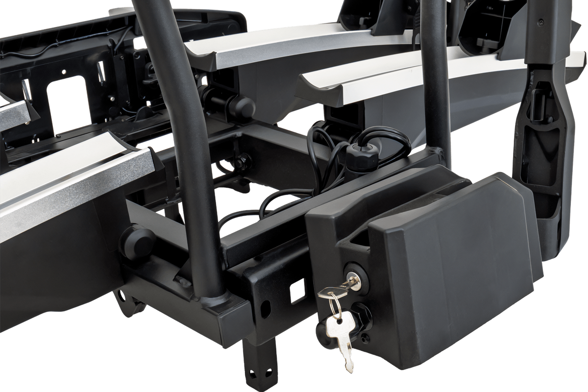 Velox 2 má dvoustupňovou ochranu proti krádeži – plošina je zajištěna zámkem zabudovaným do montážního systému na kouli tažného zařízení, zatímco kola jsou chráněna zámky umístěnými v každém z ramen, která uchopují rámy kol.