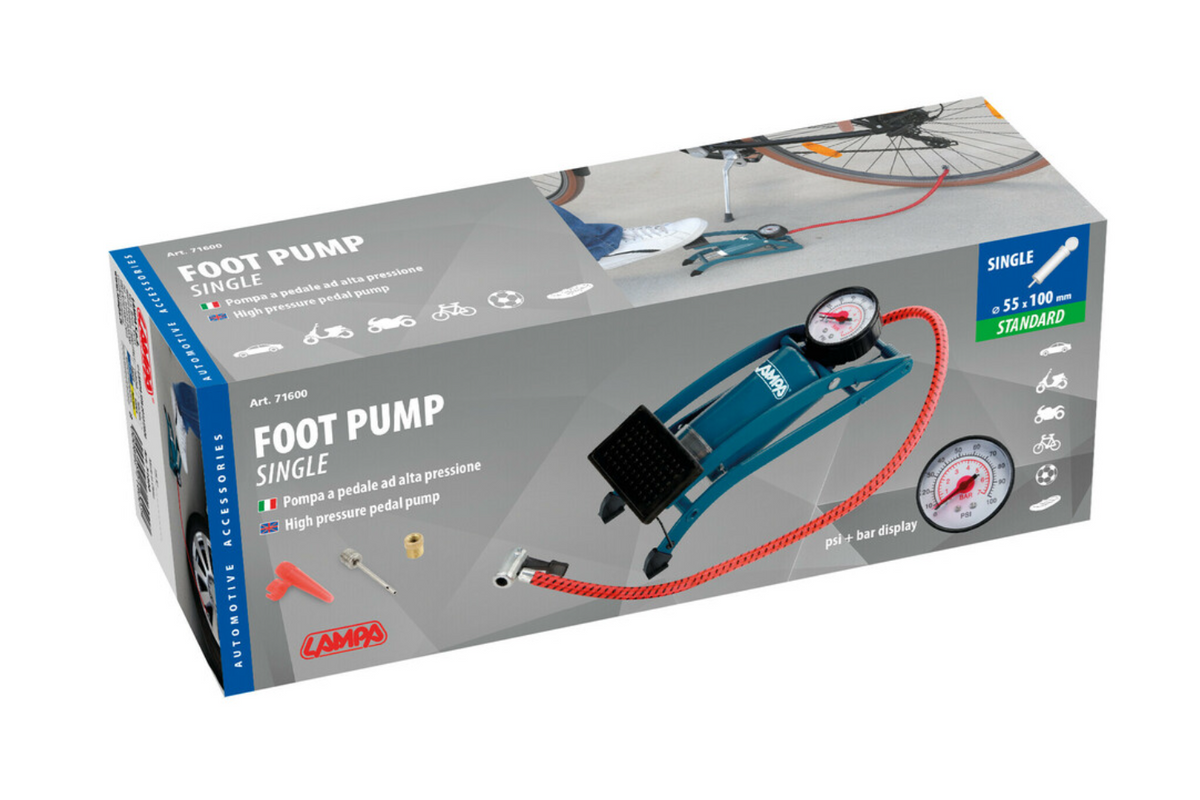- Tato nožní pumpa s jedním válcem je praktickým nástrojem pro huštění pneumatik, míčů a nafukovacích matrací. Ocelový válec zajišťuje odolnost a dodávané nástavce rozšiřují možnosti použití doma, v dílně i na cestách.