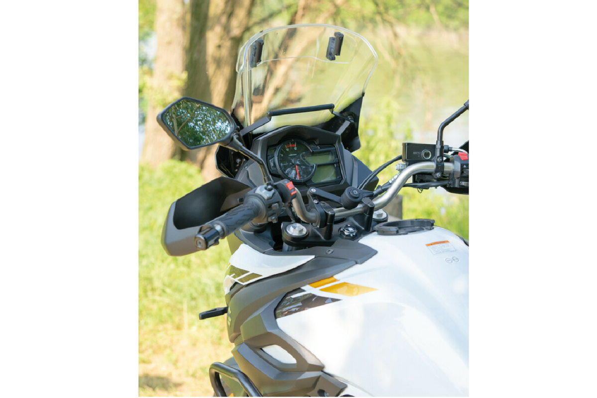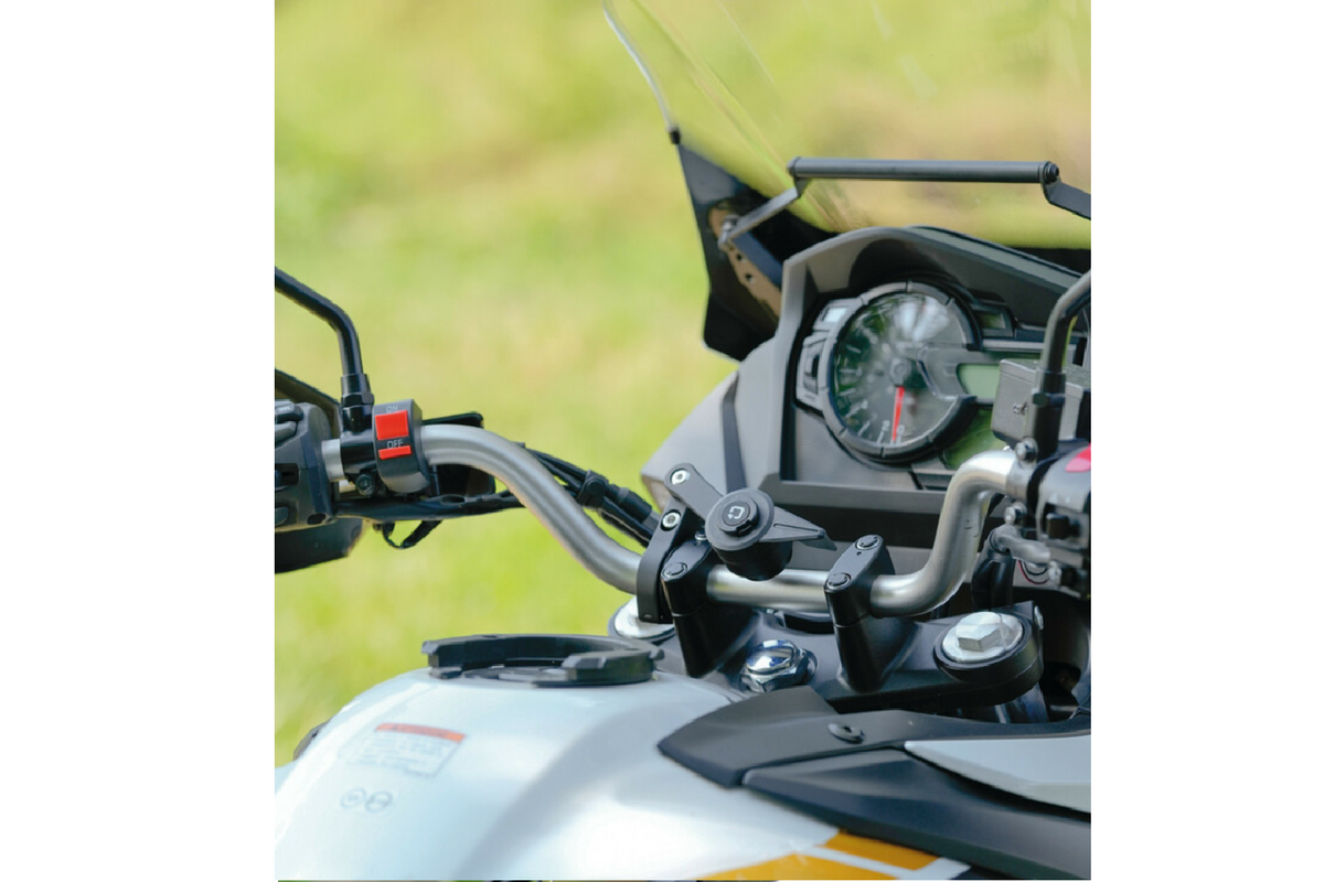 Držák je vybaven integrovaným systémem tlumení vibrací , který pomáhá chránit váš smartphone nebo fotoaparát před vibracemi vznikajícími při jízdě na nerovném povrchu. Otočný kloub ramene umožňuje umístit zařízení do optimální polohy a zajistit tak dobrou viditelnost obrazovky během jízdy. Součástí je také adaptér pro akční kamery , který rozšiřuje funkčnost držáku.