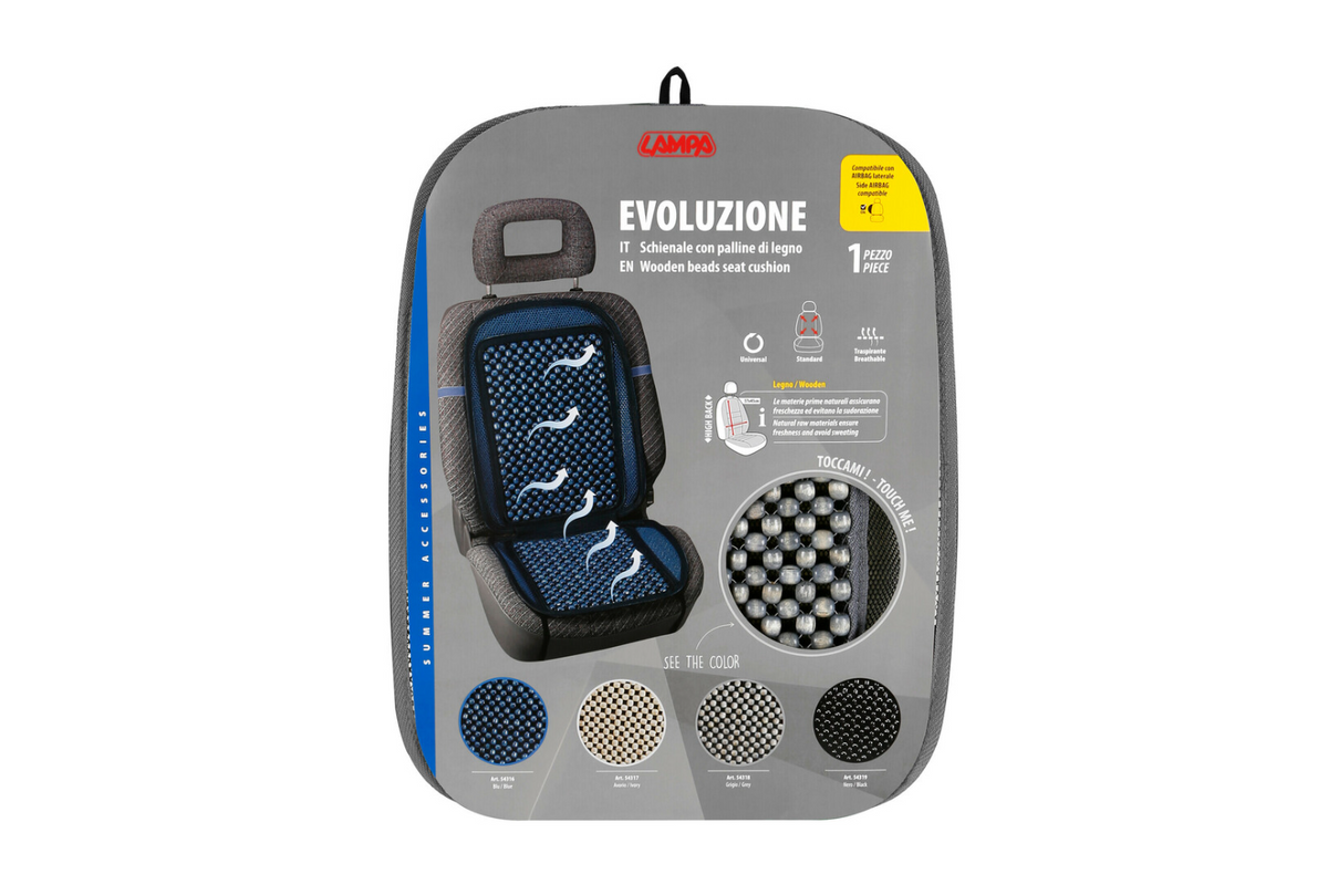 - Evoluzione je univerzální rohožka pod sedadlo vyrobená z dřevěných korálků, která zvyšuje pohodlí při jízdě. Poskytuje dobré větrání, jemně masíruje záda a podporuje krevní oběh. Je ideální pro dlouhé cesty a je kompatibilní se sedadly s bočními airbagy.